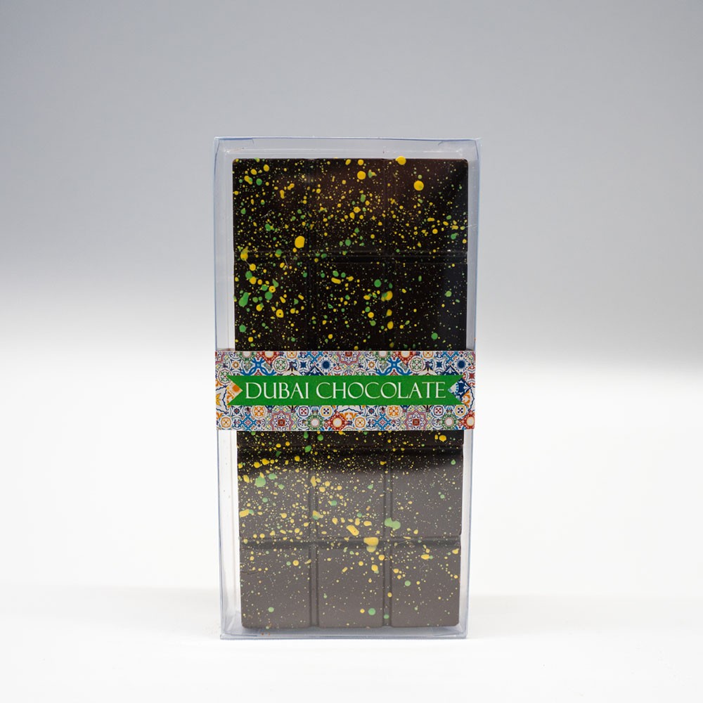 Scopri Dubai Chocolate, la nostra barretta artigianale ispirata ai sapori preziosi del Mediterraneo, realizzata con ingredienti selezionati