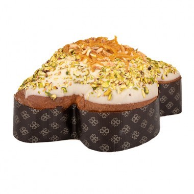 Colombra a lievitazione naturale con gocce di cremino al pistacchio, ricoperta con gianduia e noccioline pralinate. È compresa una crema spalmabile artigianale al pistacchio con granella pralinata.