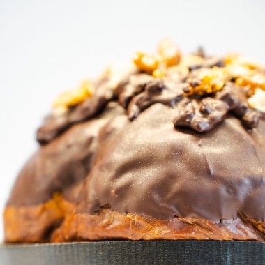 Panettone a lievitazione naturale con gocce di cremino, ricoperto con gianduia e nocciole croccanti.