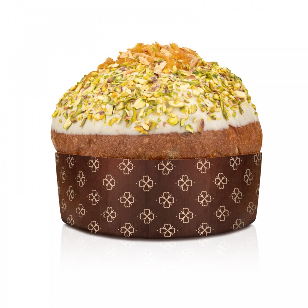 Panettone a lievitazione naturale con gocce di cioccolato bianco, ricoperto da granella di pistacchio siciliano.