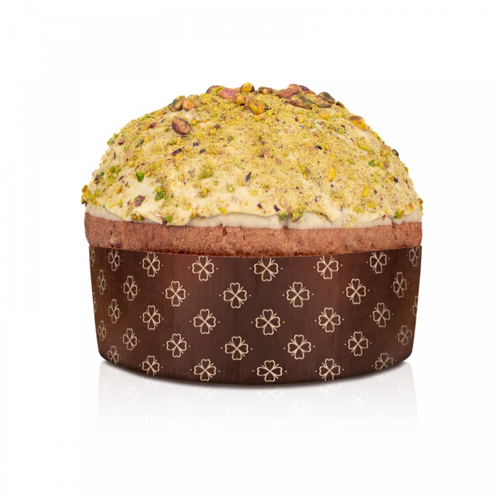 Panettone a lievitazione naturale con gocce di cioccolato bianco, ricoperto da granella di pistacchio siciliano.